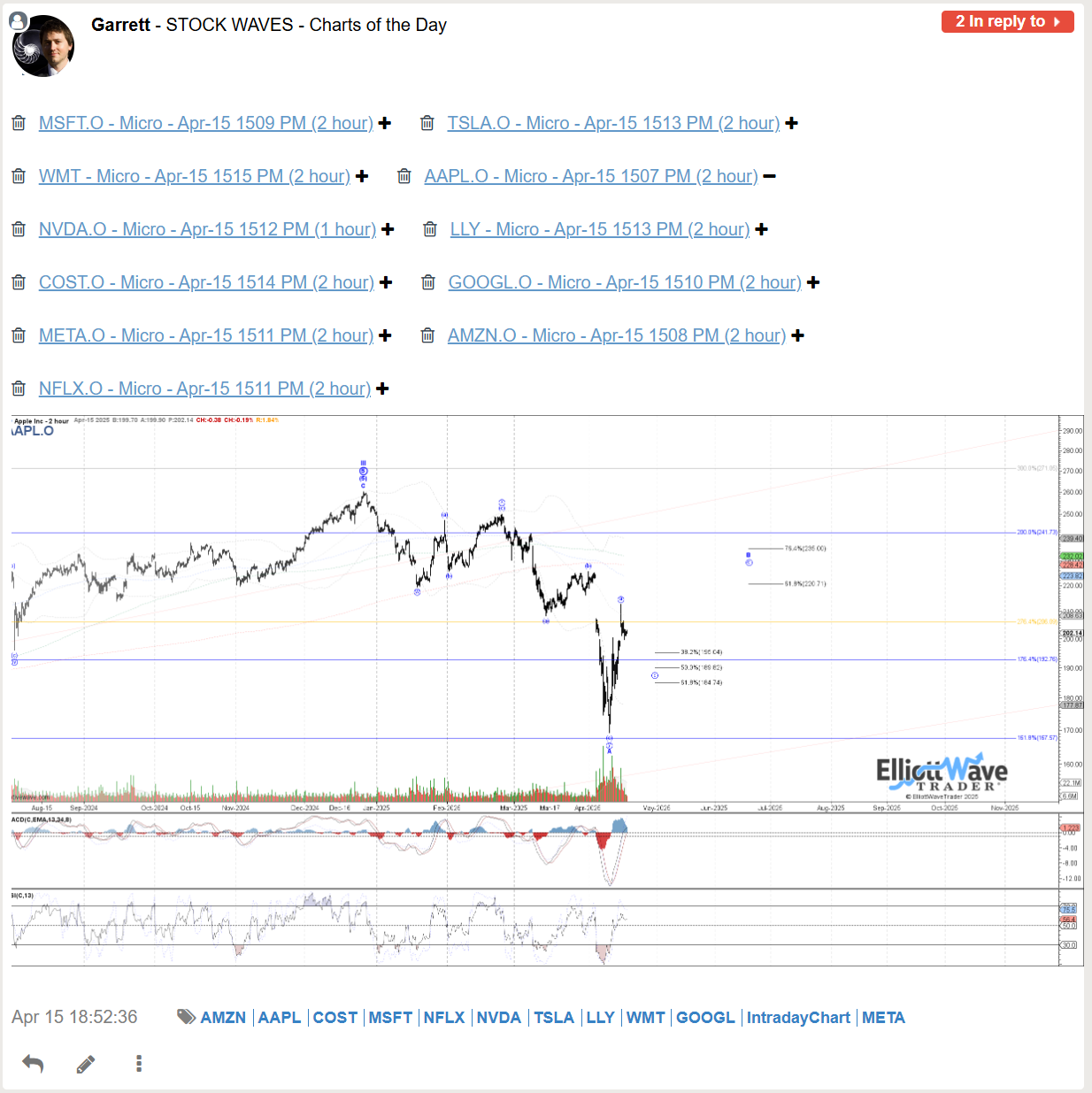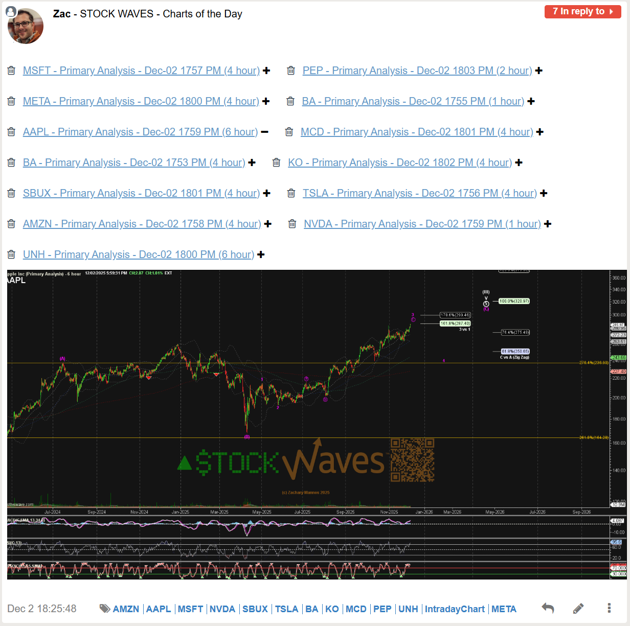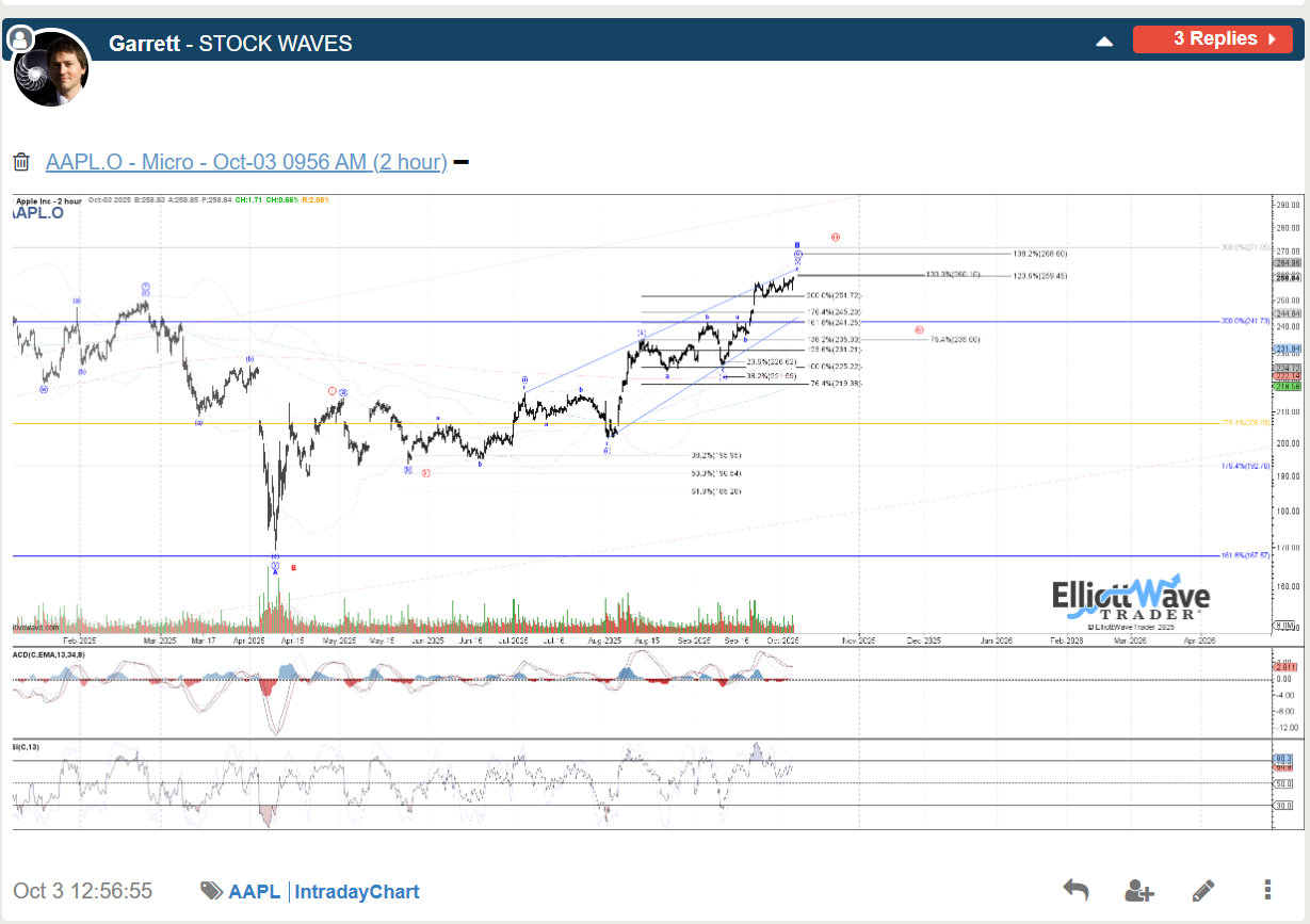 The bullish journey for AAPL in 2025 was highlighted back in April in multiple Stock Waves videos with many charts receiving Wave Setups, but initially looking for a large degree B at the time, but with the potential to head to new highs for a larger wave III. Garrett only showed his primary count in this chart capture, but like many tech charts in the video was open to it being more than a bounce.