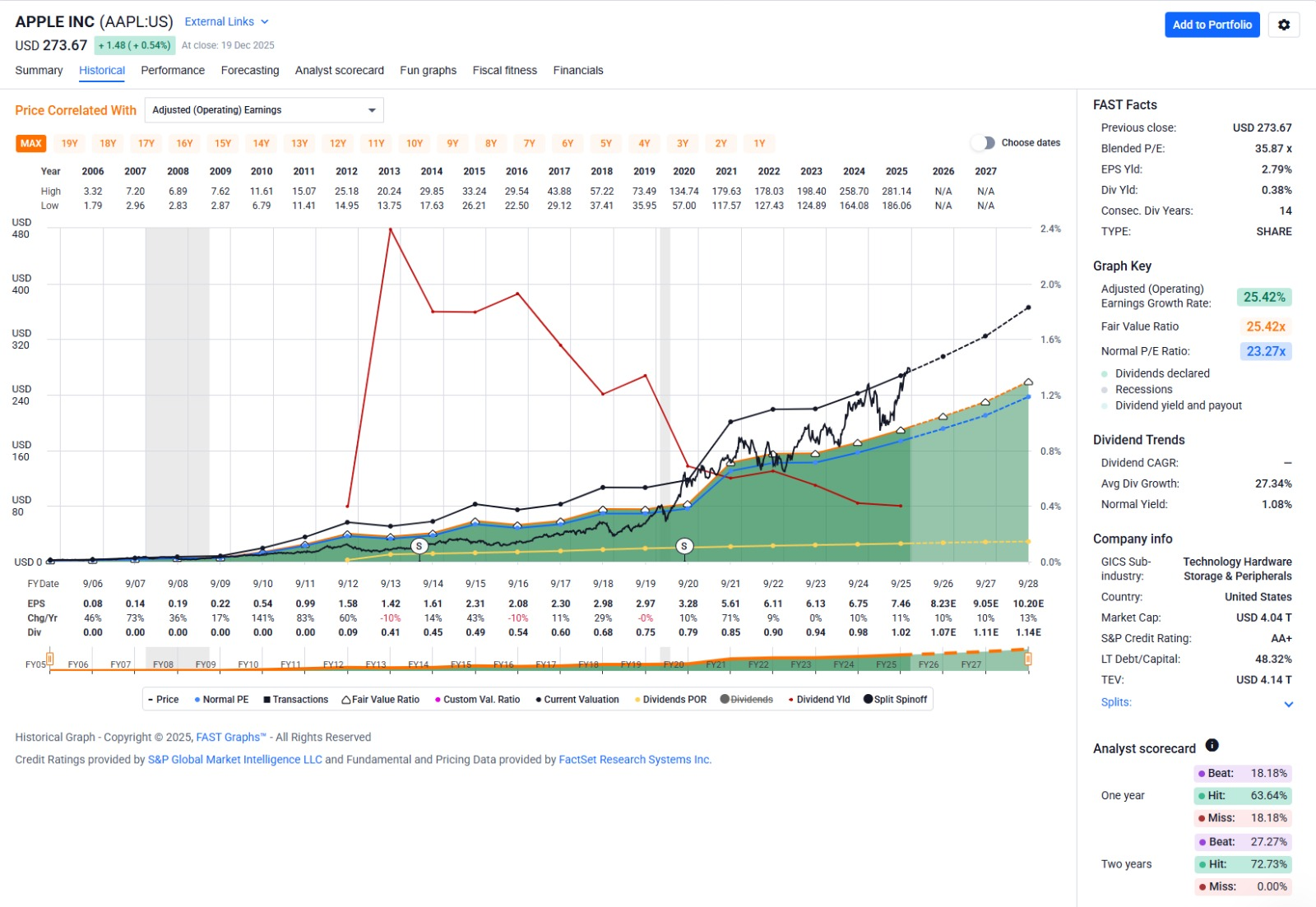 According to the Adjusted Earnings Graph, Apple has been trading well above its fair value since late 2022 for the vast majority of the time. The effect of US import tariffs has certainly put more pressure on profit margins at Apple but based on their forecasting this is expected to all be picked up by the end consumer. Costs have to be ramping up with the relocation of factories from China to other South East Asia countries, increased labor costs and general increases in the cost of raw materials and chip production.