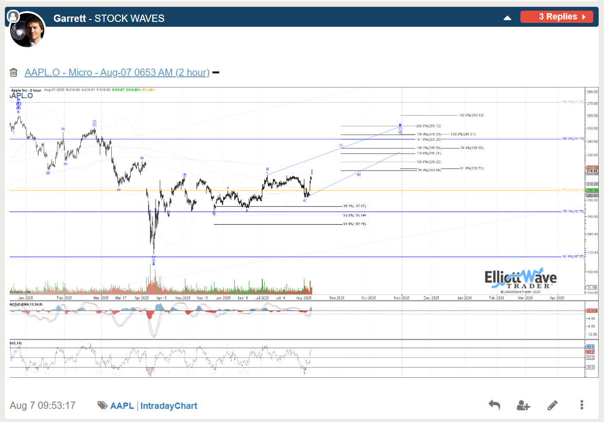 The price pattern has continued to extend, like the SPX itself with very little in the way of good entry points since late May for AAPL, with price hitting measured move resistance in early August. However by August 7th Garrett noted the structure was pointing to more of an extended upside potential for a larger circle c of B.