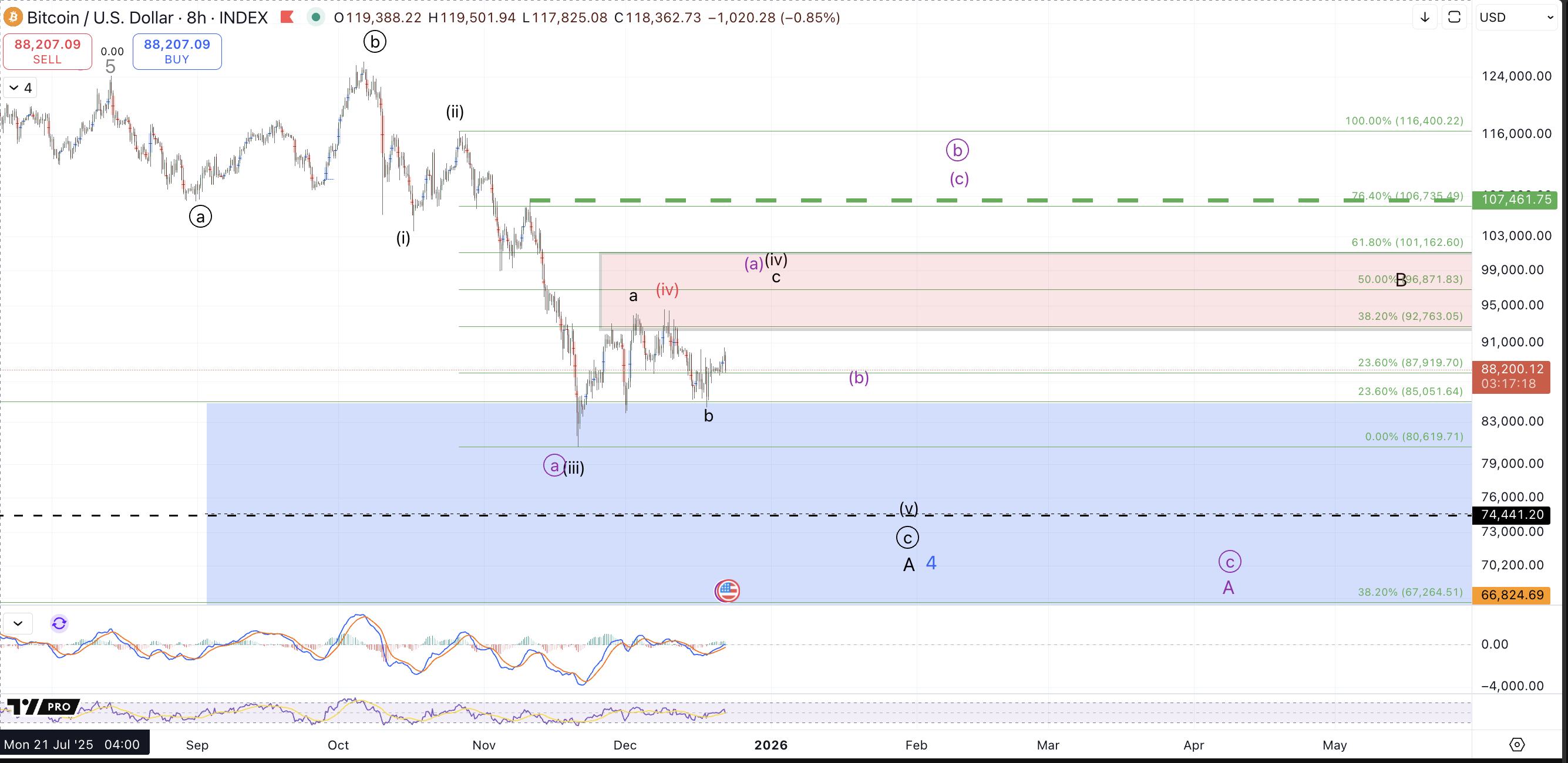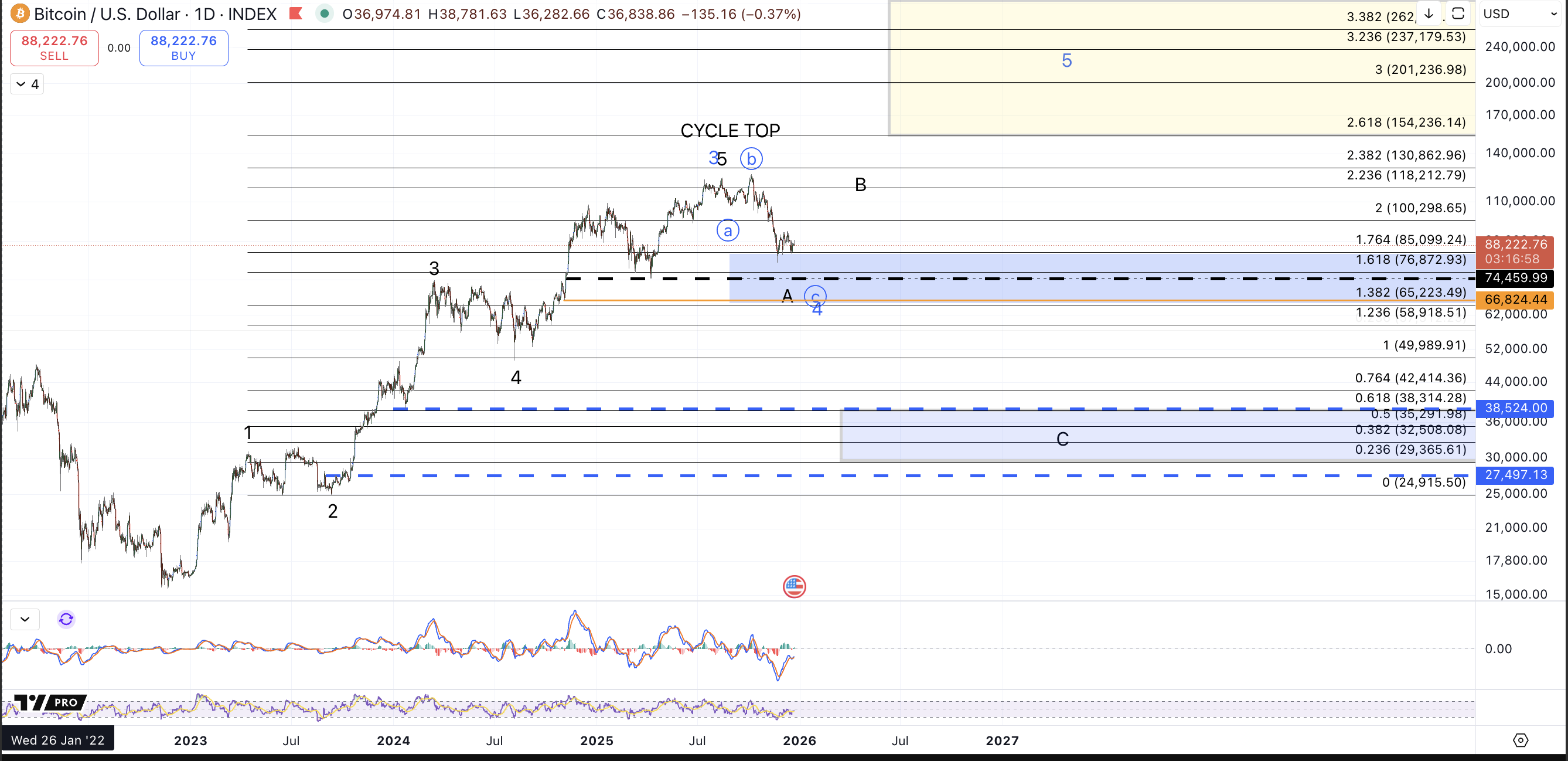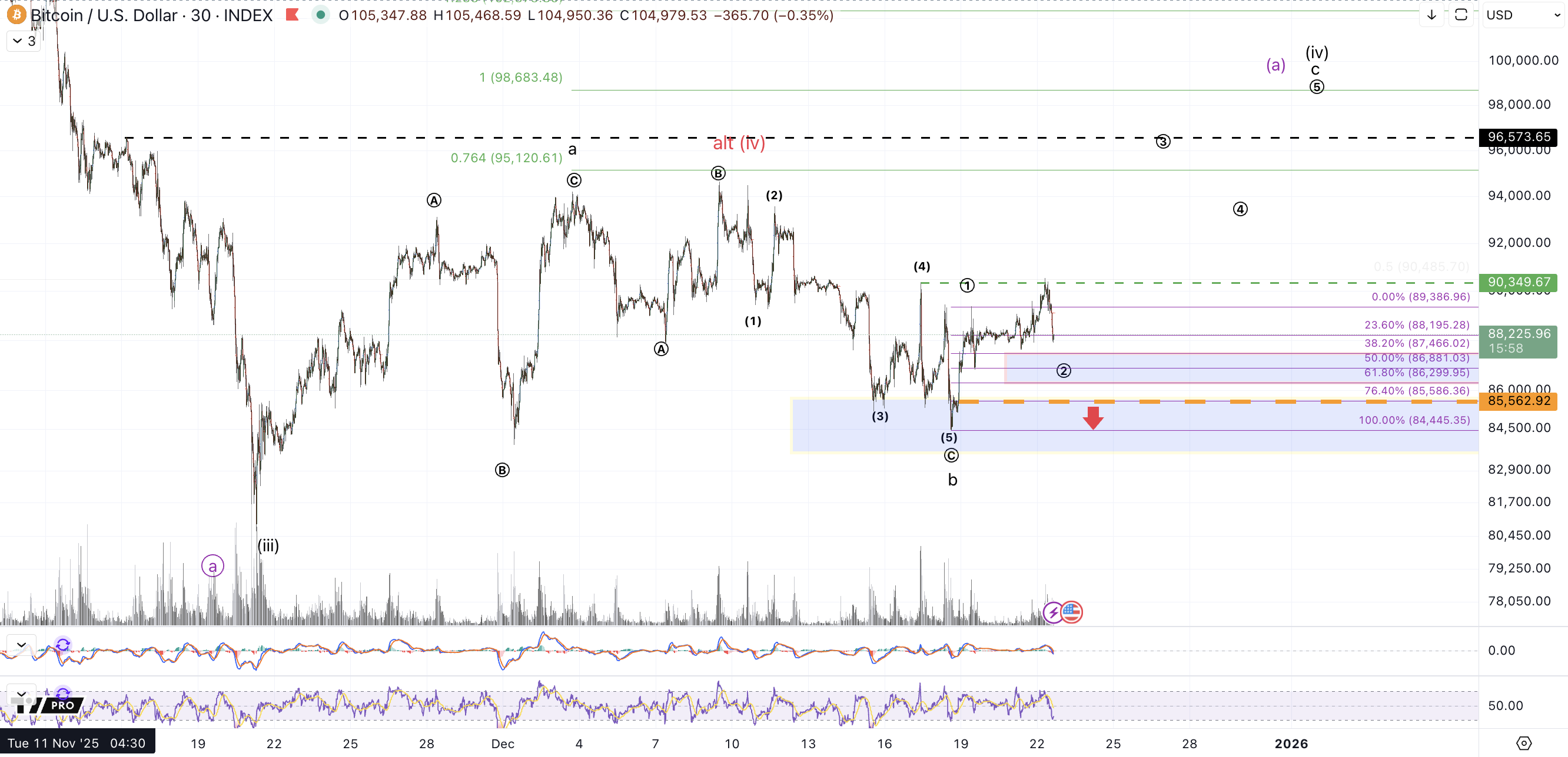 Lastly we have the purple count which in the shorter term should follow the same path as the black count for a rally up to $96k-$101k. However, unlike black, the next drop should remain corrective forming another higher low to set up another leg in a corrective bounce higher to the $107k-$117k region in a bigger circle b.