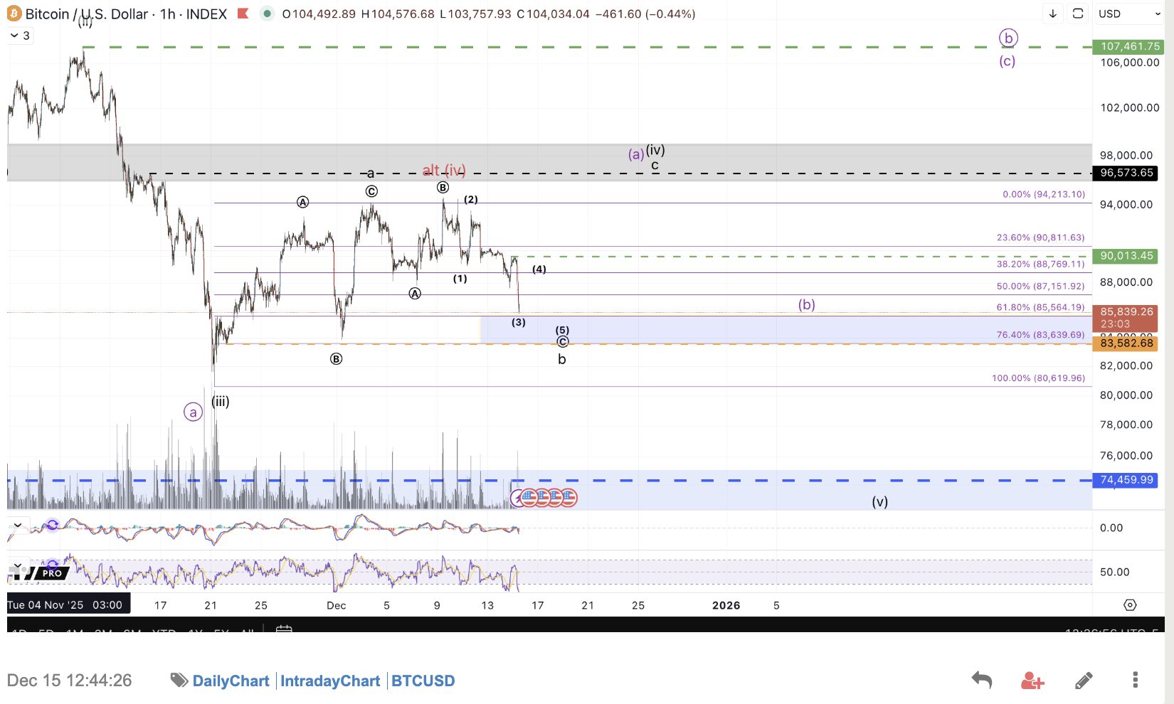 The next most immediately bearish path, which I'm tentatively considering the primary count, shown in black, entails a wider flat wave (iv) still in progress. Opposite of the red count, this path is thus far nearly picture perfect in terms of the micro count but at the larger degree entails a very protracted / expanding diagonal wave (iv) which is also hard to rely upon. That said, notice last week's micro chart (reposted screenshot below) and how well price has followed that path thus far. This count entails followthrough from last week's bottom up to $96k-$101k to complete a very wide corrective bounce as a wave (iv) from the November low with one more low to complete either the larger A down or wave 4 down into the $67k-$74k region.