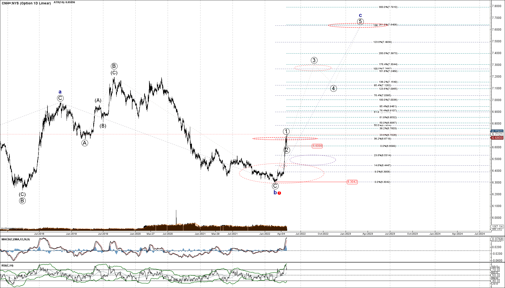 Here is our daily USDCNH (Chinese Yuan) chart from April 4, in which we called for a rally in the wave (5) of the circle 1, targeting the 6.67 area.
