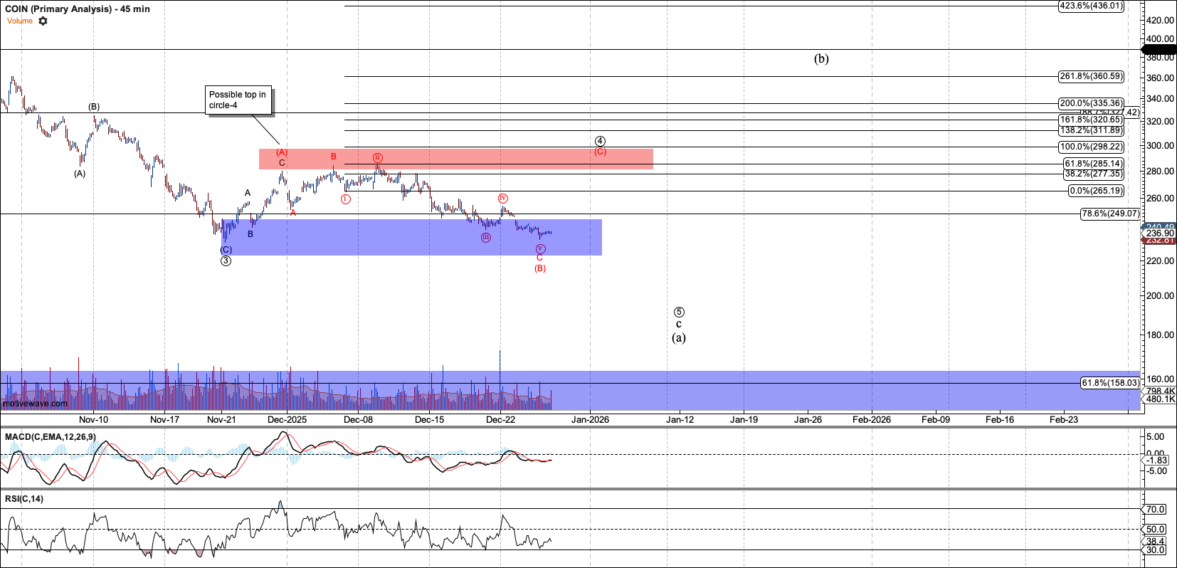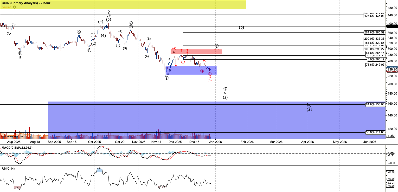 If you think that pain has ended for COIN investors with the rally off the November low, think again. This rally is clearly corrective, having the structure one expects of a fourth wave. So long as COIN holds under $300, I have a projection for circle-5 to reach $200 before a more intermediate rally comes to give COIN holders relief.