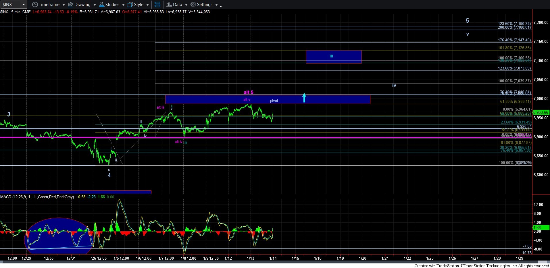 Support remains at 6900SPX, and resistance is clearly the pivot. My primary is looking higher for now, especially as long as we holding over 6900SPX support. The next target is delineated by the target box for wave iii in the 7100-7127SPX region. Should we reach that target, support will be raised to the 7010-7040SPX region.
