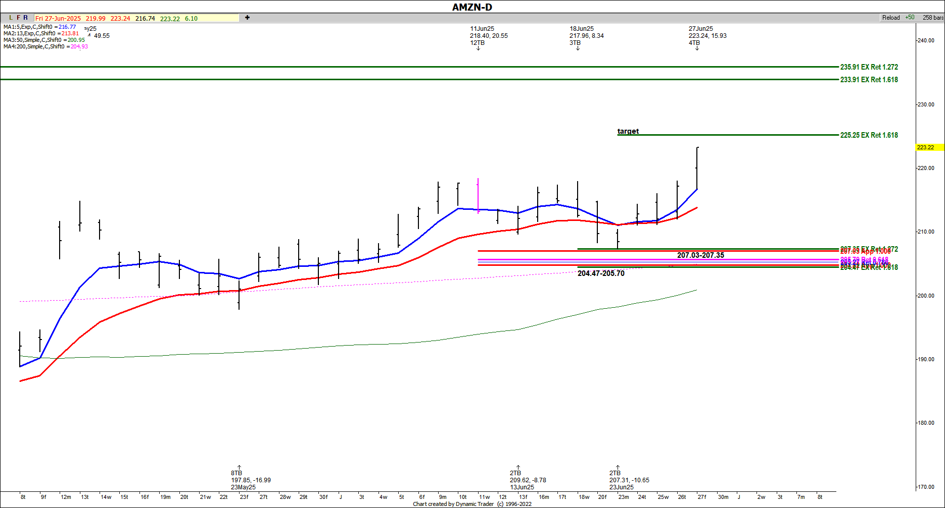 AMZN has now met target 1 and is shooting for target 2 at the 225.25 area. Since we've met our first target we are trailing up stops on longs. So far we've seen a rally of $15.93 off that first key support. Setups don't always hold, however, and this is why we place our stops below the setup zone in the case of a buy entry!
