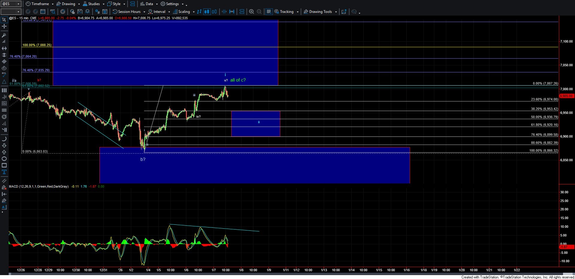On the other hand, a decisive break below the 6953–6899 support zone would significantly shift the outlook. That scenario would open the door to a larger degree top, consistent with the green count. From there, I would be looking for a break below 6800 to provide further confirmation that a higher-degree top is firmly in place.