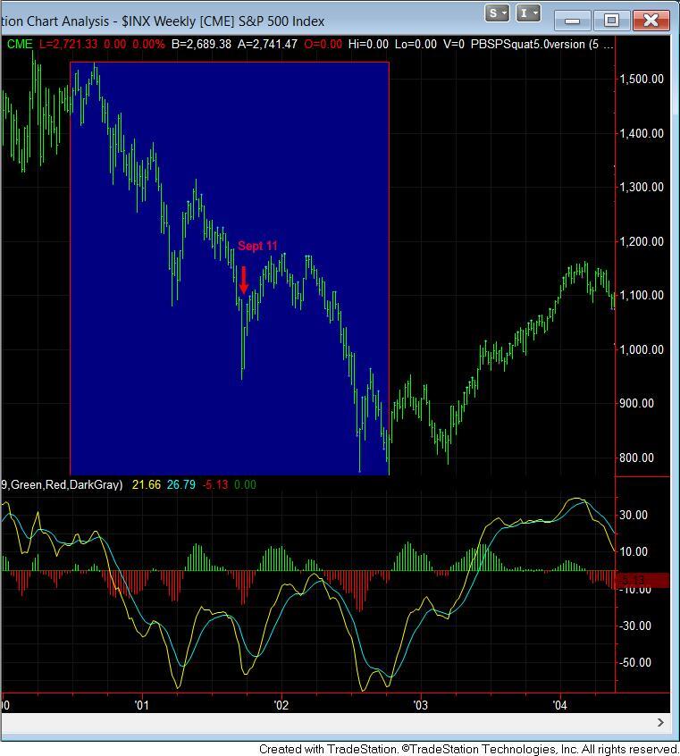 As you can see from the attached chart, the stock market was already within a multi-year bear market when 9/11 occurred. Moreover, and most shockingly, the market was approaching a near term low when 9/11 occurred, and the market was actually higher within two to three weeks after 9/11 than where it was on 9/11.