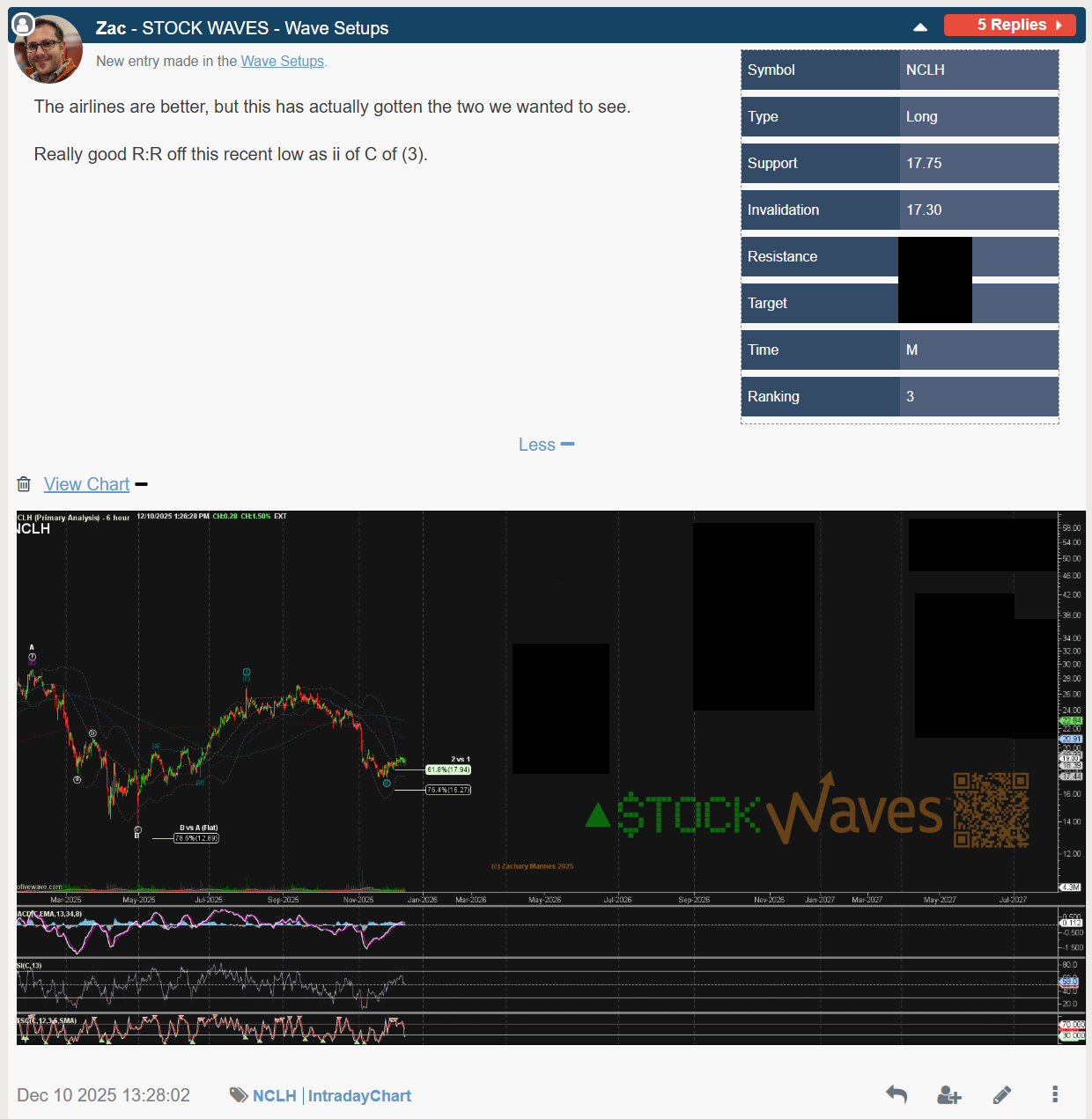 Zac Mannes has been actively tracking the travel sector macro trends via Elliott Wave analysis for a long time, and he had been tracking several bullish potentials heading into earnings in February 2025. Price initially popped higher following earnings, allowing for a winning exit, however price did not continue that bullish trend for long and headed lower into the 13s in April of 2025 when many stocks found their footing.