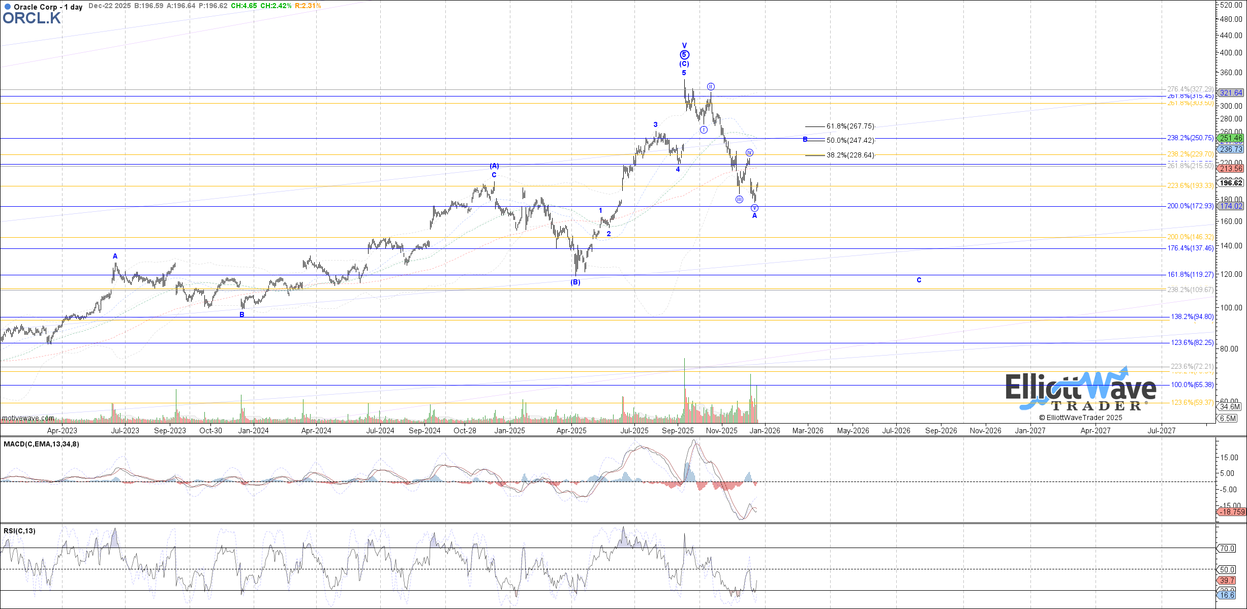 In the case of ORCL stock, price has formed what appears to be a clear 5 waves down from that last major high. This structure would communicate the likelihood that a long-term peak in price has been struck. It’s a key reversal that will be further confirmed by a corrective bounce, perhaps to as high as the $240 area over the next several weeks.