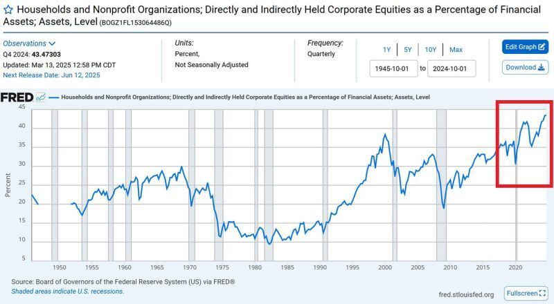 As I said at the start of this missive, when the market gets too bullish, that is when we strike a major market top. And, based upon the following chart from the Fed, it looks like everyone is piling into the stock market at historic proportions.