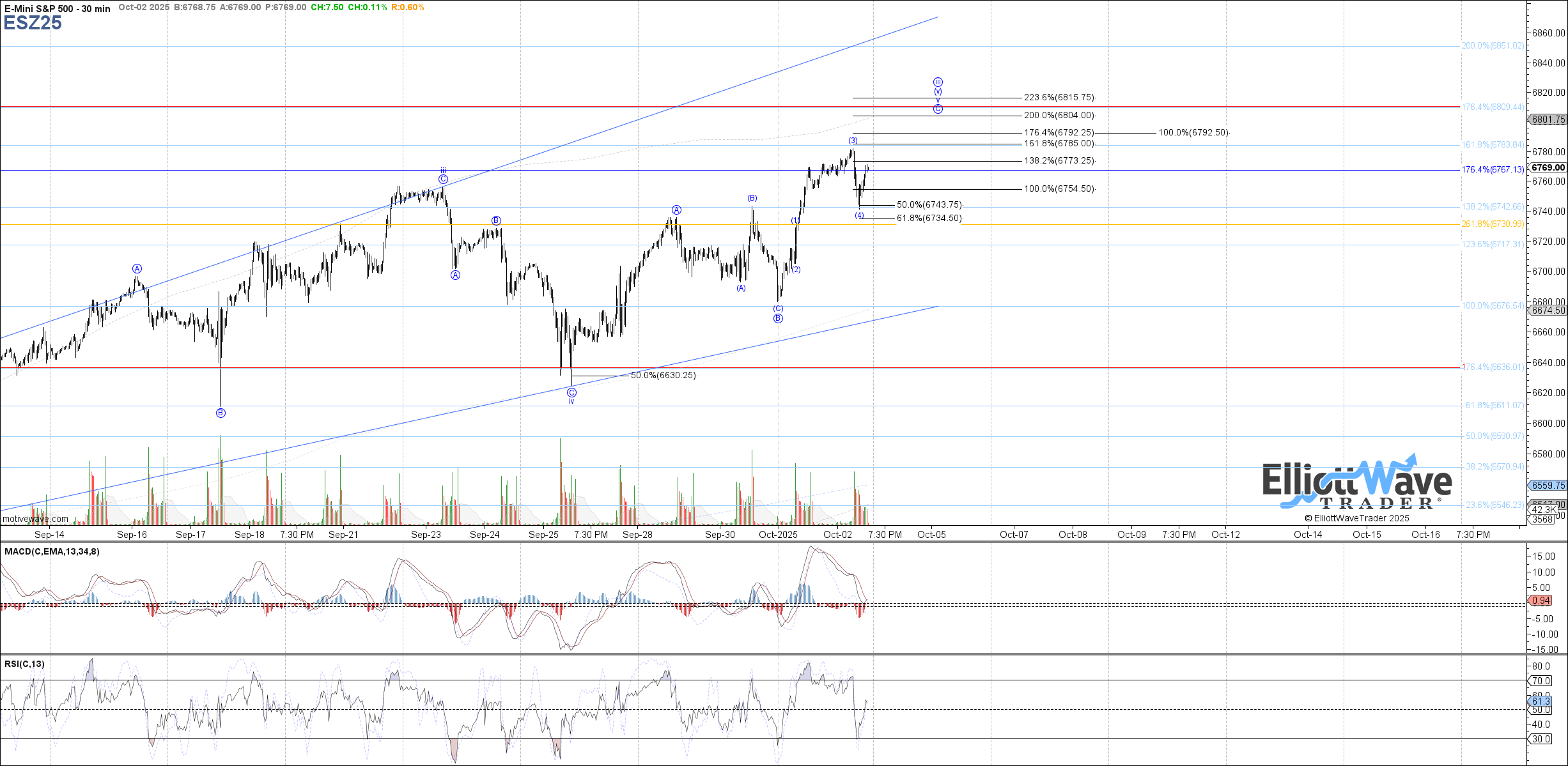 Therefore, as long as the low made this morning holds, the expectation is that price will attempt at least one more high from here with 6792 as the ideal minimum target to reach before wave (5) of C completes, followed by 6804 as the next potential target.