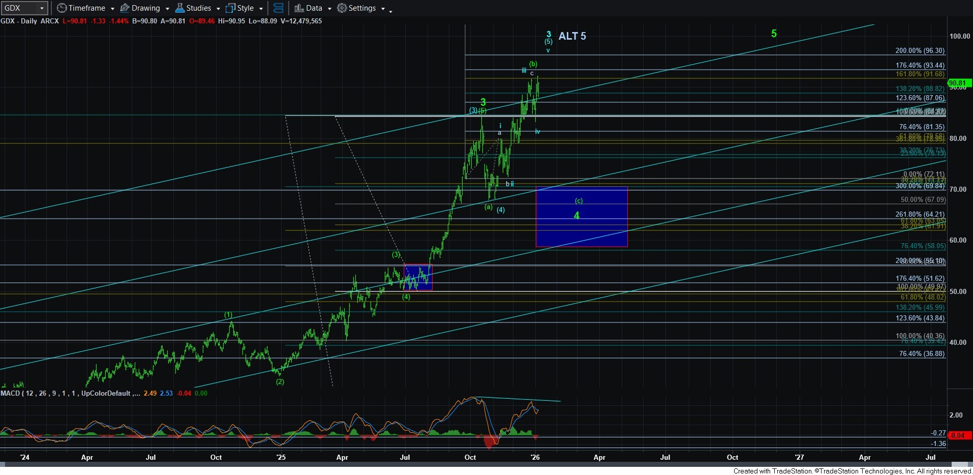 As far as the alternatives to the b-wave count, I have added a blue count which is akin to the yellow counts in both GDX and silver, which would suggest we have only begun a bigger (a)(b)(c) pullback in wave 4 in gold. Note that we have come up high enough now in gold to allow for a (c) wave decline and still be in the wave 4 in the diagonal, which would likely target the 4200-4280 region should we see a full (c) wave decline. But, as I said, this is going to have to be an alternative right now since I cannot say the decline is CLEARLY a 5-wave structure.