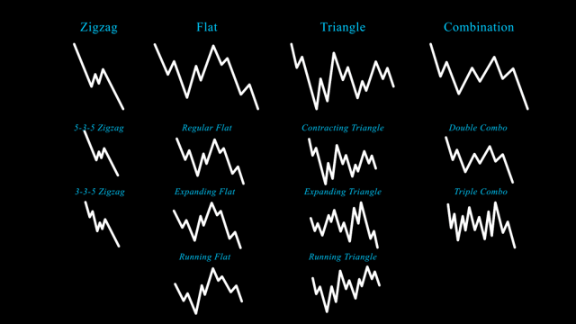 Overall, corrective waves can be grouped into four separate categories: zigzags, flats, triangles, and combinations. Within each category there are also distinct variations of each pattern that can be considered subsets of the larger category. The amount of variety displayed by corrective waves means that patience and flexibility must be exercised when analyzing them in real-time.