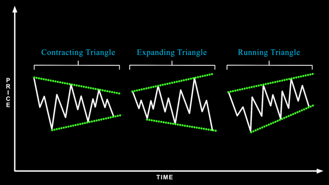 Running Triangles are the rarest variety, occurring when the underlying trend is so strong that the overall structure is skewed in the same direction, similar to a running flat. The trend lines connecting the price extremes of each subwave will either be contracting or parallel, but both sloping in the direction of the underlying trend.