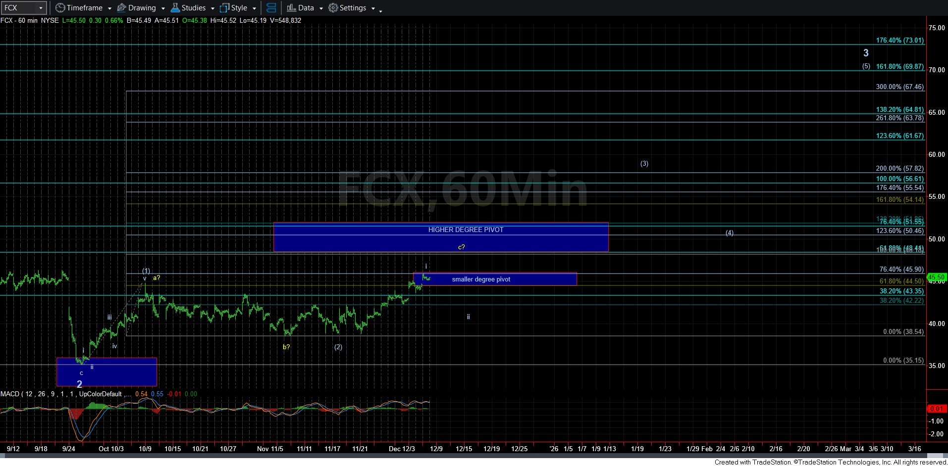 So, this chart presents two wave degree of Fibonacci Pinball extensions. I have also labeled the smaller degree pivot as well as the higher wave degree pivot.