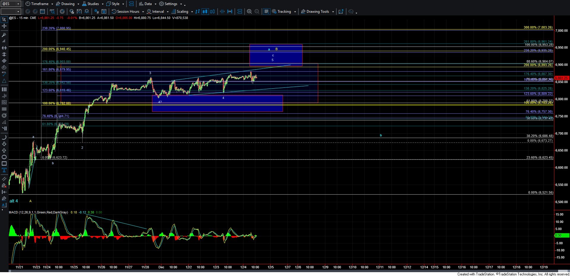 From there, the next move lower becomes key. It will help clarify whether we are dealing with a top in wave A per the blue count, suggesting a larger ending diagonal that could still take us back to new highs, or whether the market may be putting in a larger wave B top per the yellow count. A corrective decline would support the blue count, while a five-wave move lower would open the door to the larger top implied by the yellow count. Additionally, a move back over the 6,904 level would increase the probability that the blue count is the operative structure.