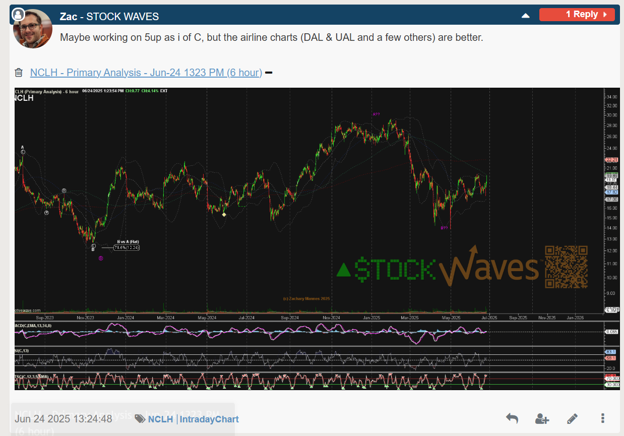 Zac Mannes has been actively tracking the travel sector macro trends via Elliott Wave analysis for a long time, and he had been tracking several bullish potentials heading into earnings in February 2025. Price initially popped higher following earnings, allowing for a winning exit, however price did not continue that bullish trend for long and headed lower into the 13s in April of 2025 when many stocks found their footing.